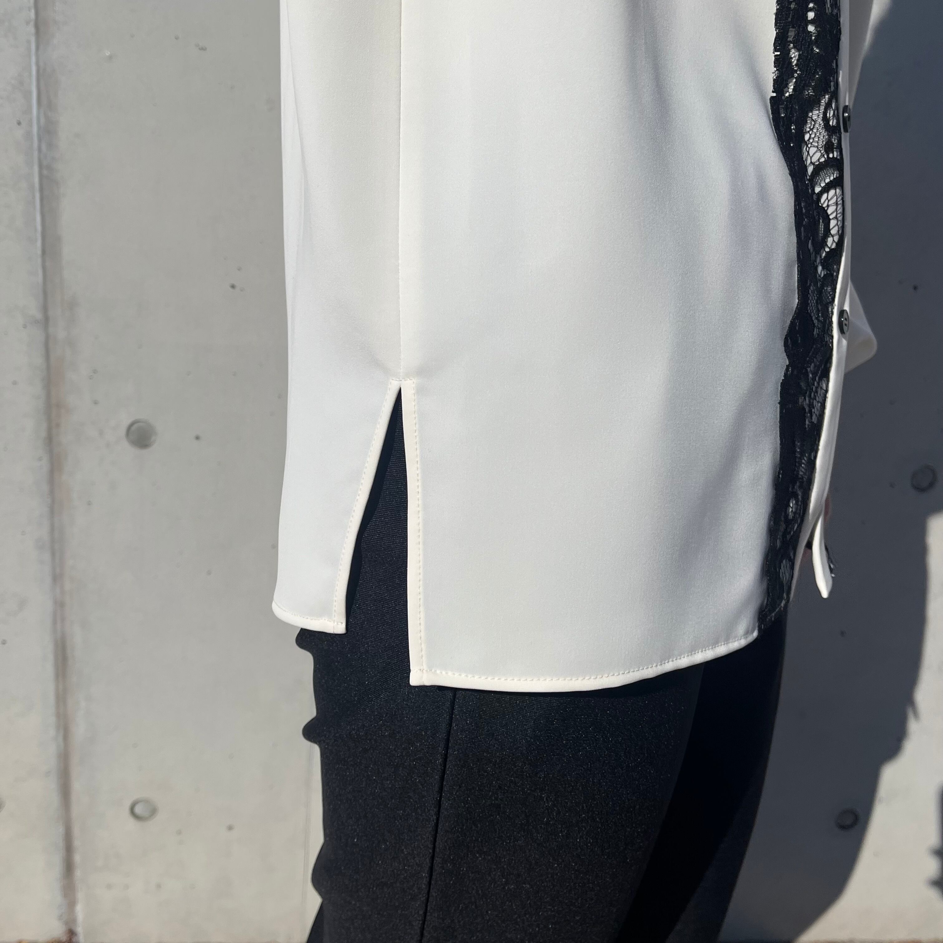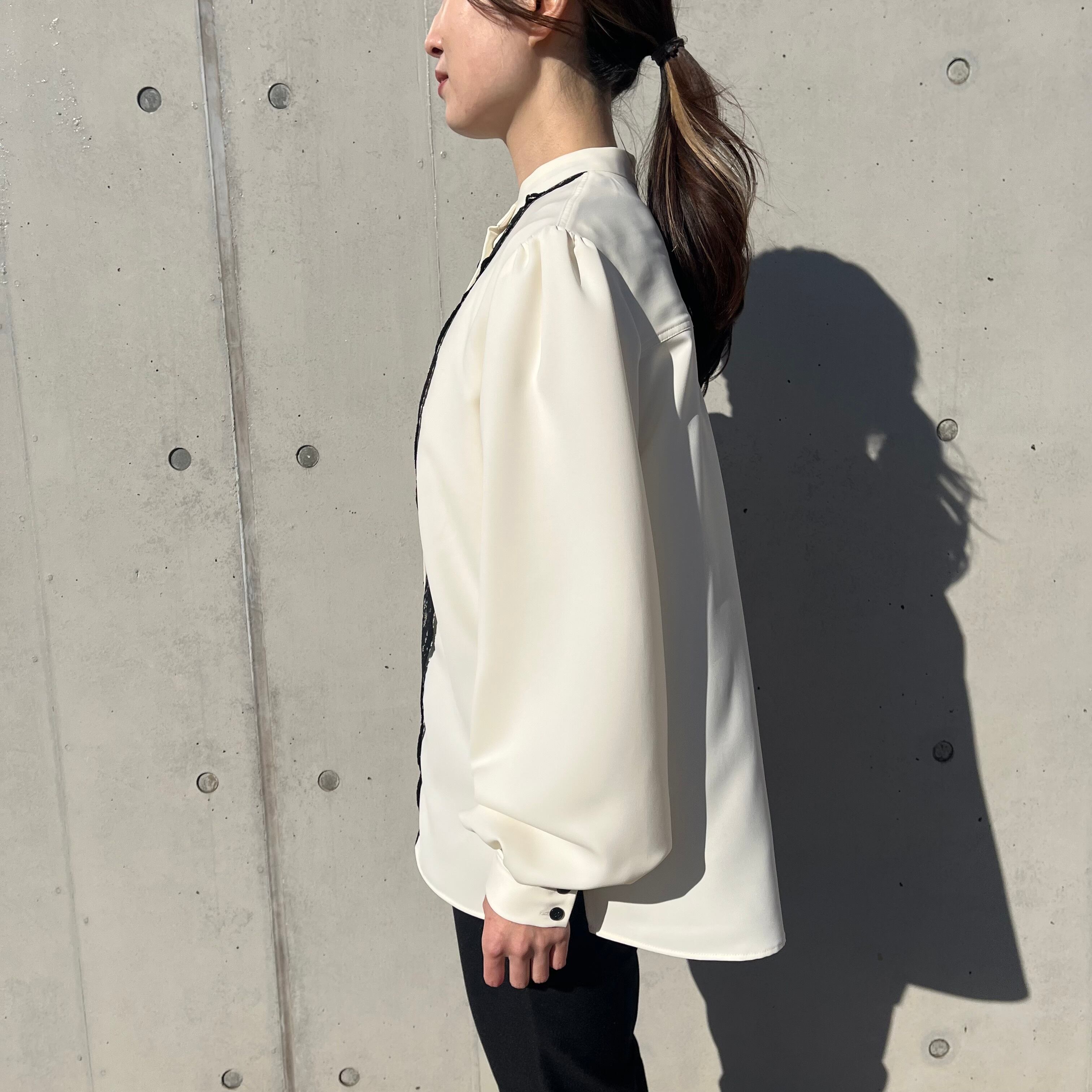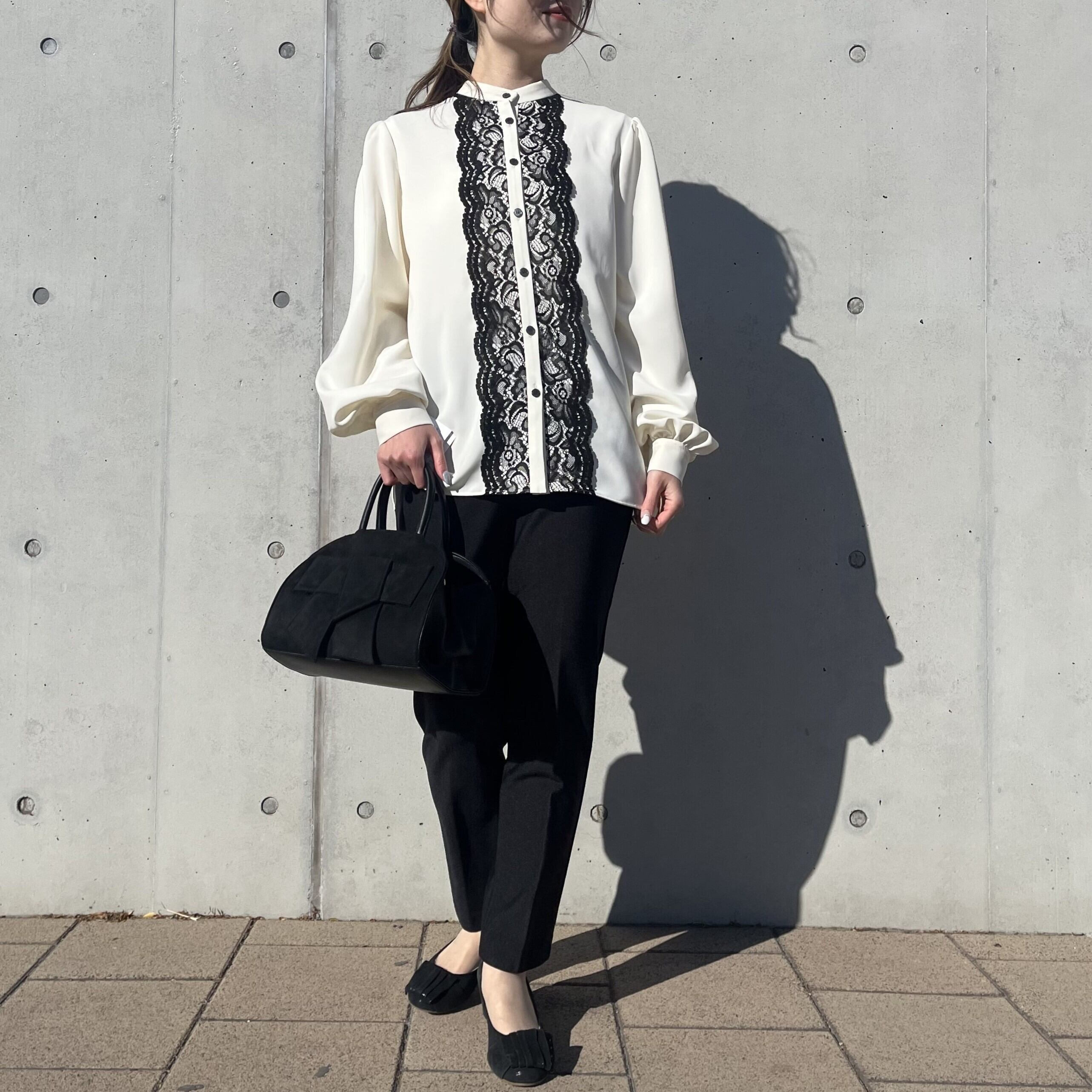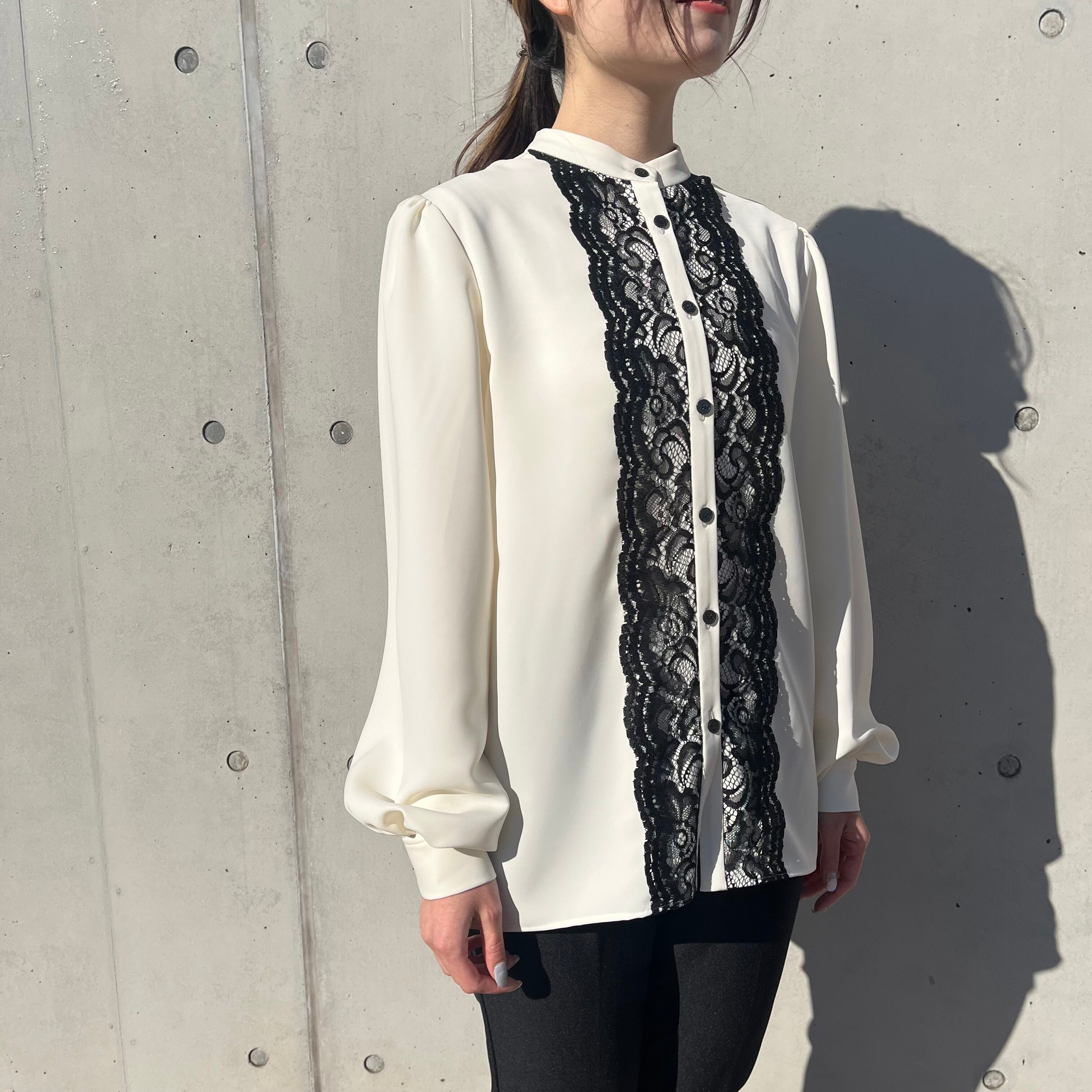 フロントに贅沢にあしらったレーススカラップがエレガントなブラウス。