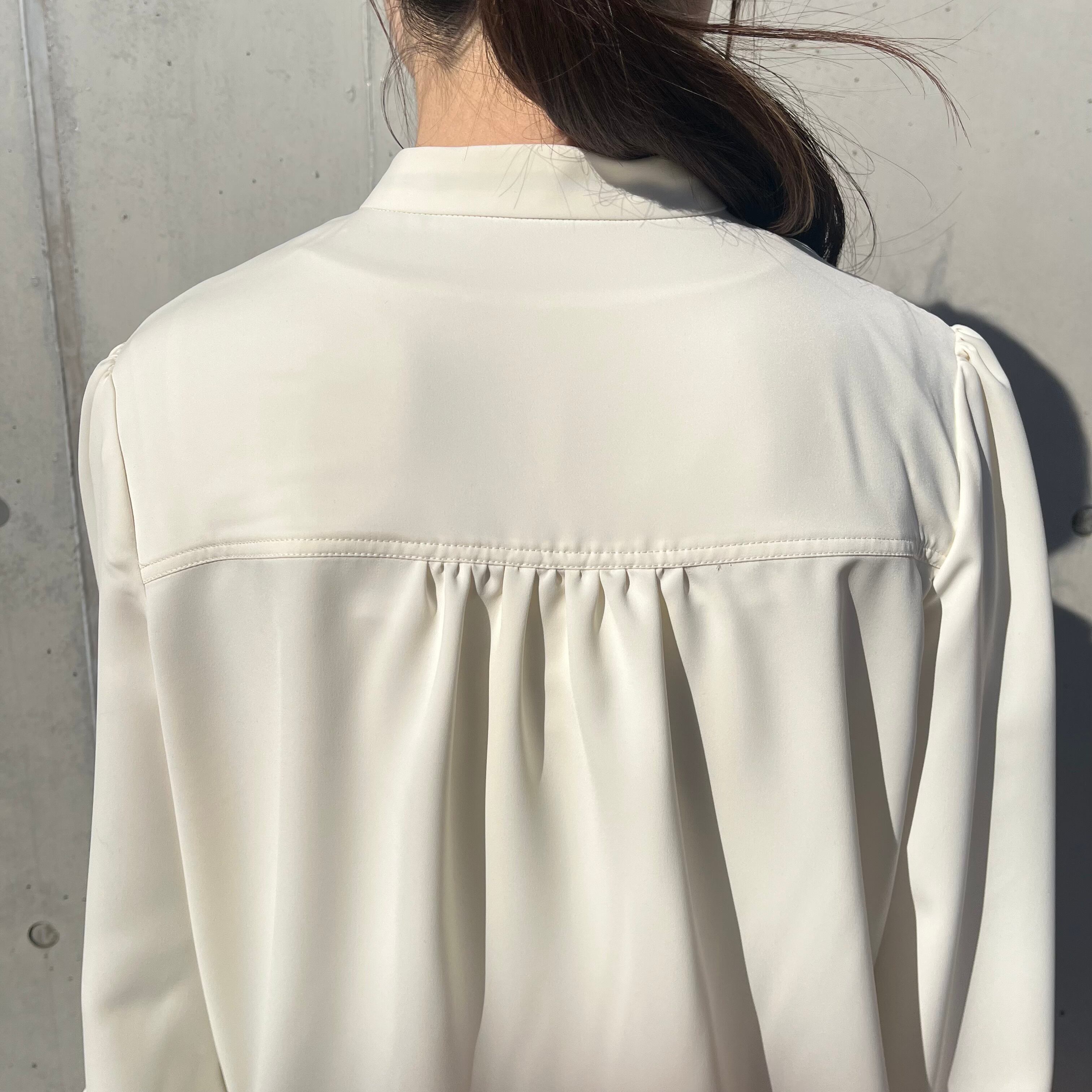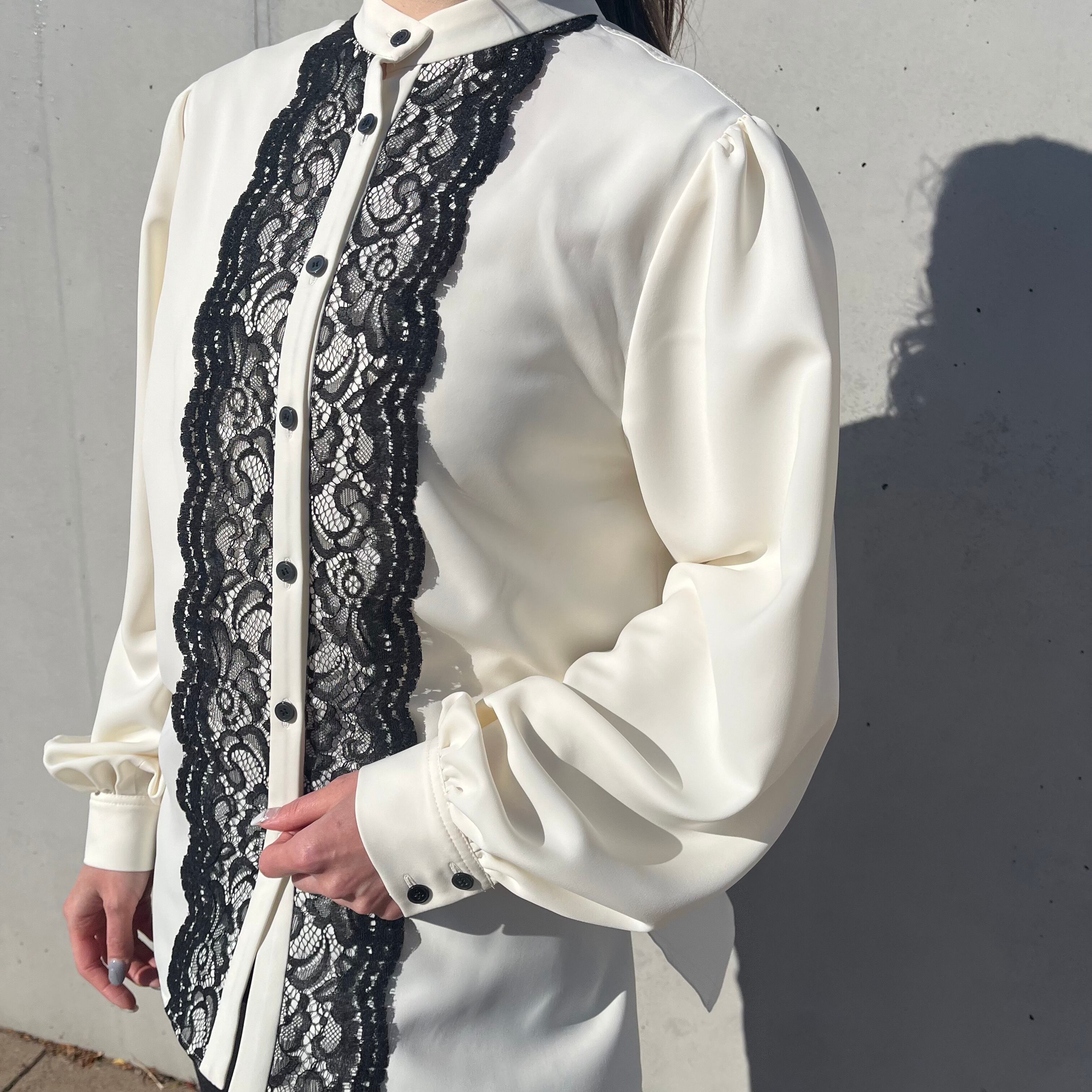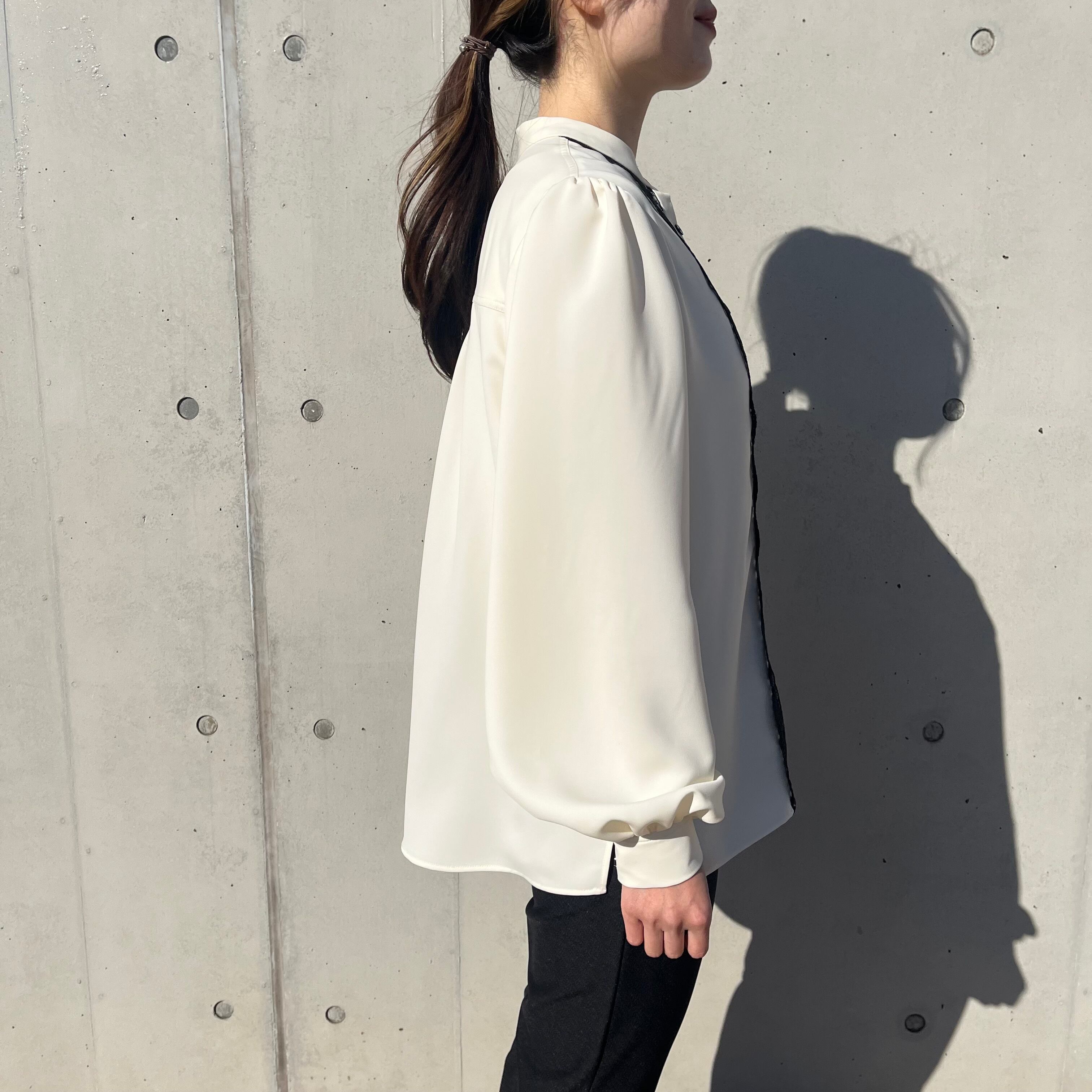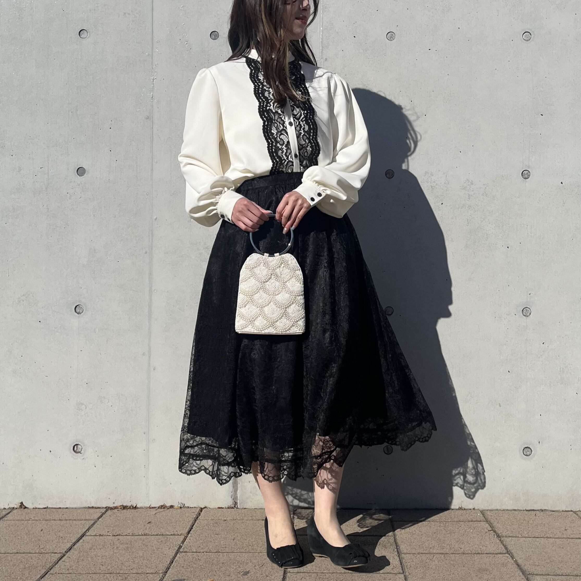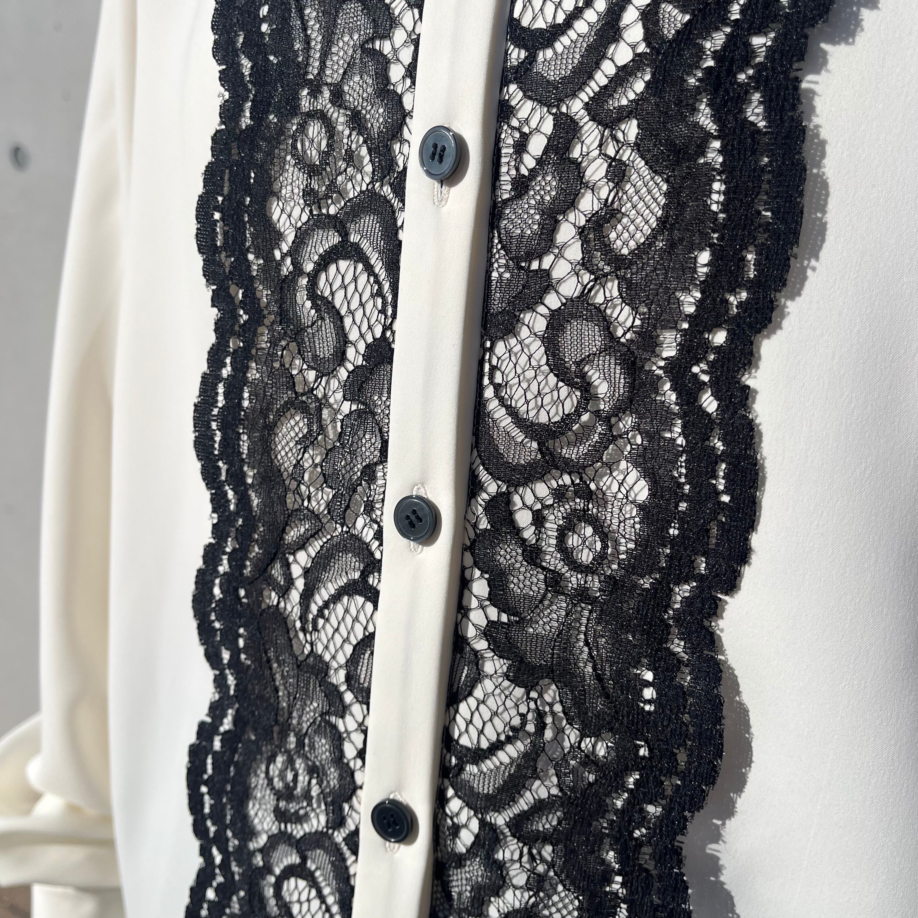 フロントに贅沢にあしらったレーススカラップがエレガントなブラウス。